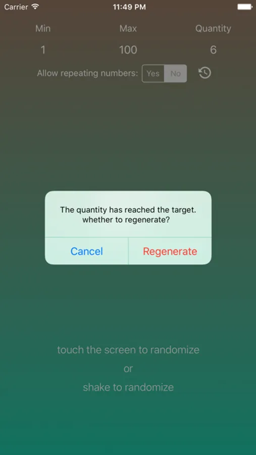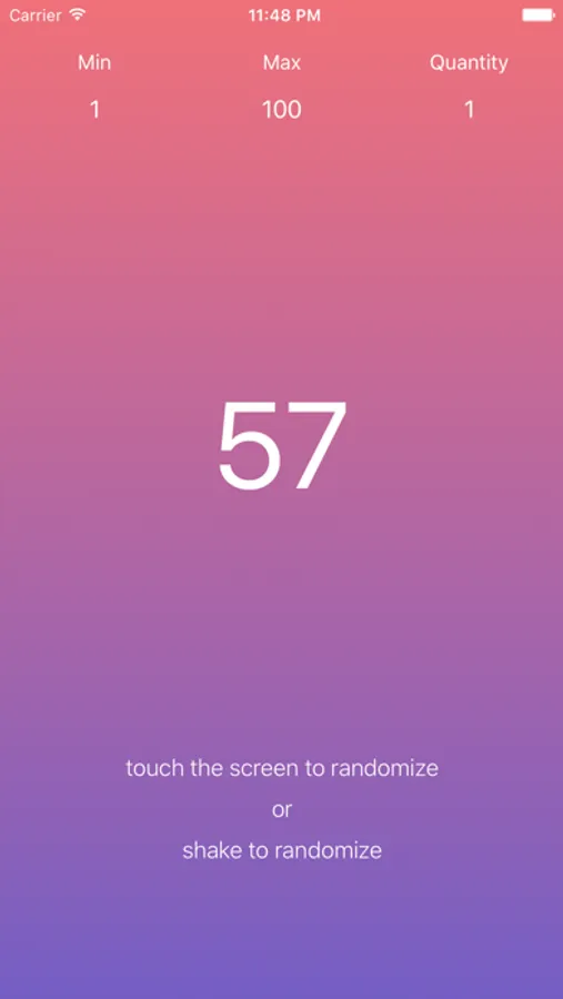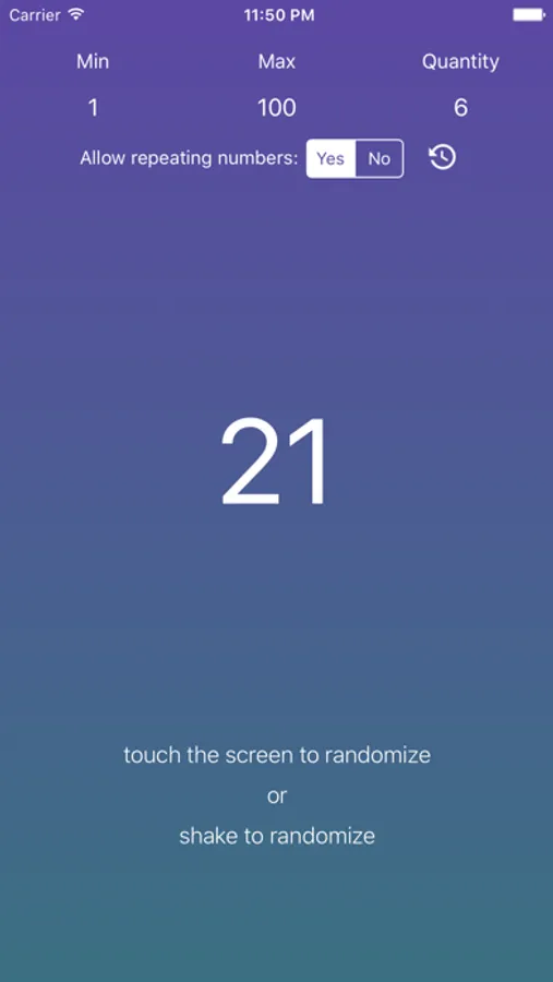 All you have to do is put in the boundaries for your number and touch the screen or shake the device. Immediately you get a randomly generated number. Touch the screen or shake as many times as you need to with the same parameters.