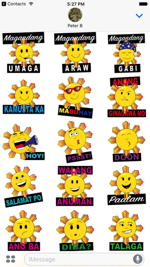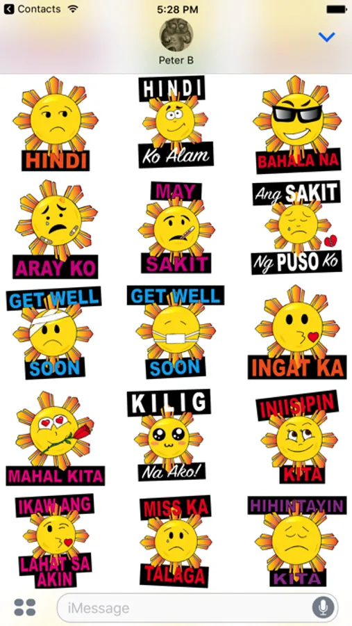 In the expressions category, our Philippine sunmoji acts as the voice, emotion, and face of popular Pilipino expressions and sayings. The collection includes holiday greetings, I love you (Mahal Kita), and Salamat Po (Thank you). Use one of these stickers for holiday greetings, express how you're currently feeling, or impress your friends with an awesome Pilipino phrase or saying.