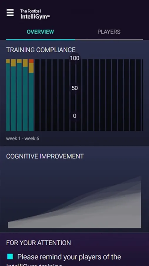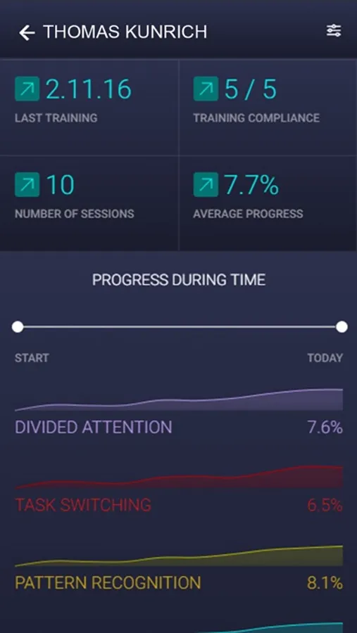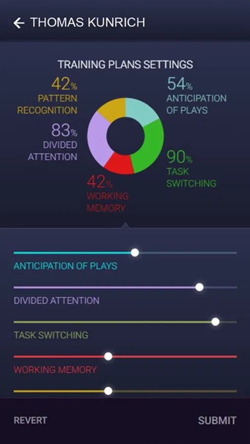 For each player, the app will show how many training session were carried out so far, when the recent training activity took place and what the progress to date is. Furthermore, for each player the app presents performance metrics in five cognitive skills vital for footballers: anticipation of plays, working memory, task switching, divided attention, and pattern recognition. On top of monitoring, the application enables coaching staff to fine tune and personalize the training emphases beyond the system own choices.