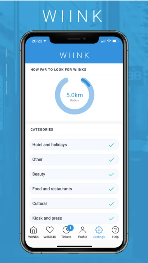 - Geolocation: choose the radius in which you want to see the available WIINKs.
