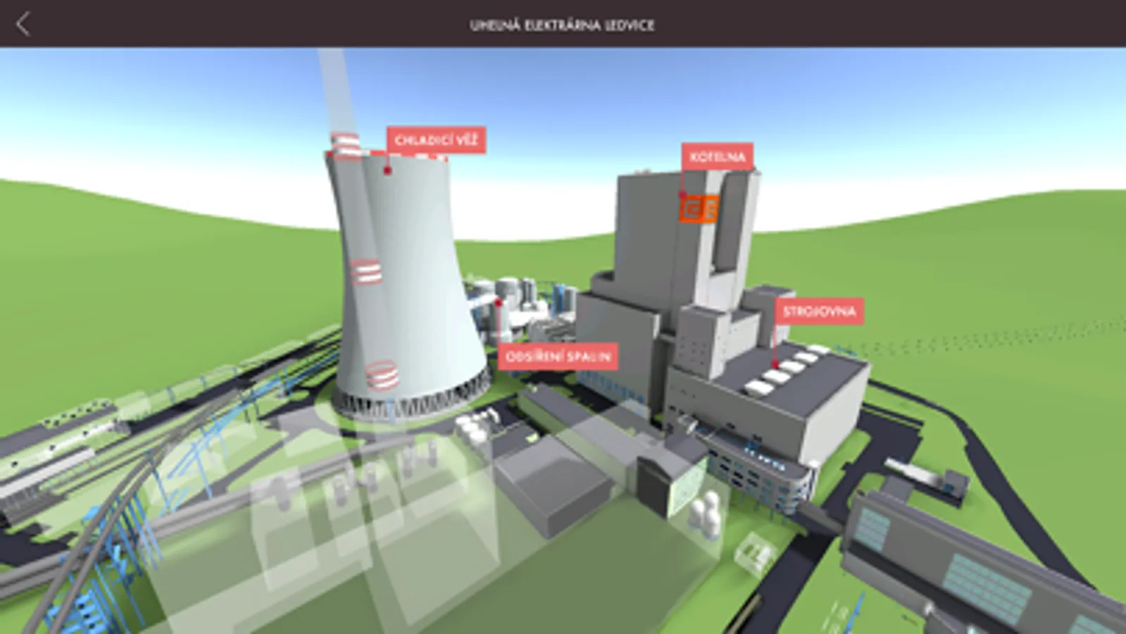 Technologie uhelných elektráren je prezentována na modelu moderního Nového zdroje Elektrárny Ledvice, vodní elektrárny jsou zastoupeny akumulační a přečerpávací elektrárnou ve Štěchovicích. V úvodu každého zdroje se můžete seznámit s dispozičním řešením celé elektrárny, výběrem zvýrazněných objektů se dostáváte stále hlouběji přes technologické celky až k jednotlivým zařízením, tvořícím klíčové uzly v technologickém zapojení elektrárny. Tato informační úroveň obsahuje detailní 3D model vybraného zařízení a množství doplňujících informací. Kromě konstrukčního hlediska a vizualizace funkčnosti zařízení jsou to informace, týkající se teoretických podkladů, konkrétní instalace zařízení, galerií a rozhovorů s obsluhujícím personálem nebo možnost vyzkoušet si řešení praktických úloh a interaktivních příkladů.