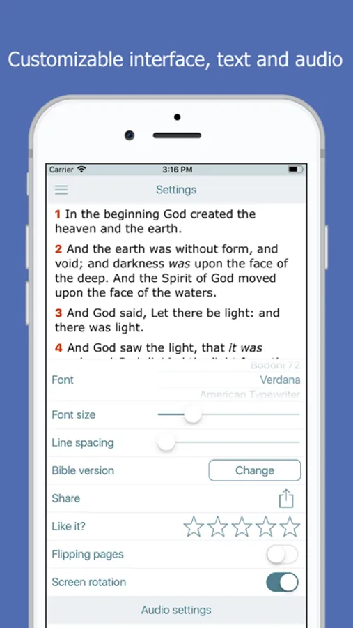 Fast search, simultaneous works with multiple verses, text and audio customization, flipping pages option -- all works offline