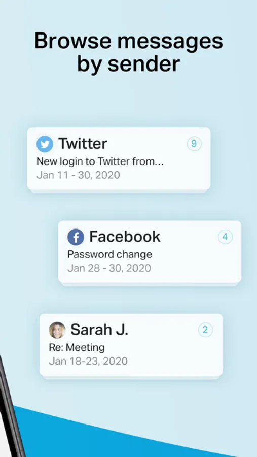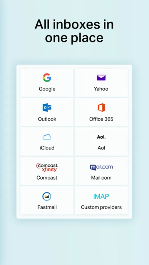 See all of your inboxes at once. Works with Gmail, Exchange IMAP, Yahoo, Hotmail/Outlook, iCloud, AOL, Google Apps, Microsoft 365, Fastmail, and all standard IMAP accounts.