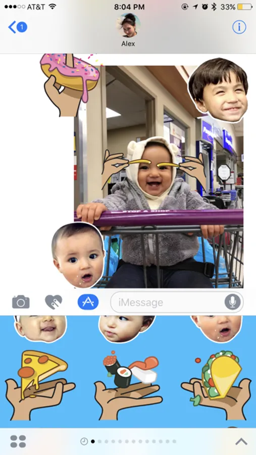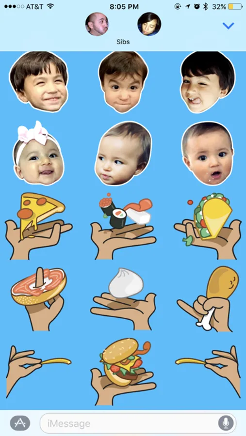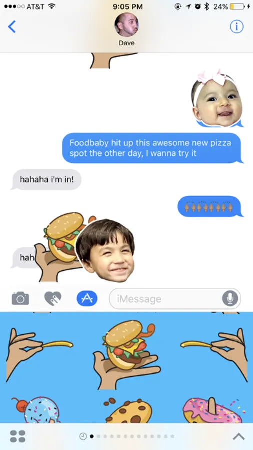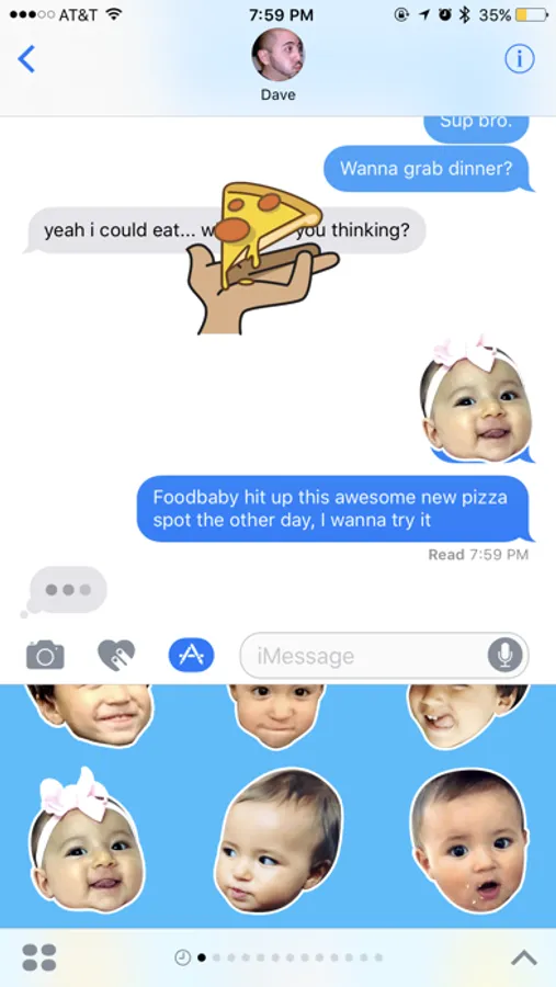 Finally, you can use stickers to text what you want to eat along with appropriate expressions from everybody's favorite Instagram foodbabies. Plenty of foods they are frequently seen behind are available, along with two stickers to help you put Frybrows on your friends.