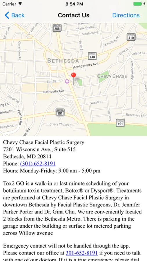 Tox2GO® is a drop in or spur of the moment way of scheduling the wrinkle reducing treatment of botulinum toxin injections. Tox2GO is affiliated with Chevy Chase Facial Plastic Surgery. Chevy Chase Facial Plastic Surgery was founded in 2003 by Dr. Jennifer Parker Porter in Chevy Chase, Maryland. The practice offers surgical and nonsurgical facial plastic surgery treatments to patients in Maryland and the surrounding areas. The app allows users to schedule last minute appointments for Botox® , Jeuveau®, or Dysport® treatments with facial plastic surgeons and contact or get directions to the practice. The Tox2GO app also allows future patients to learn more about the practice and procedures available.