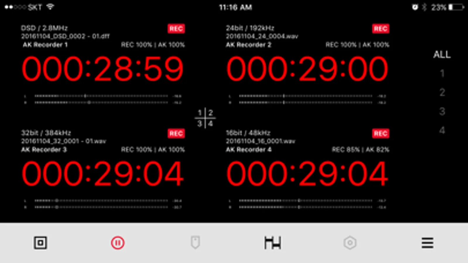 The application supports up to 4 AK Recorders, and of course you can start or pause the recordings of each