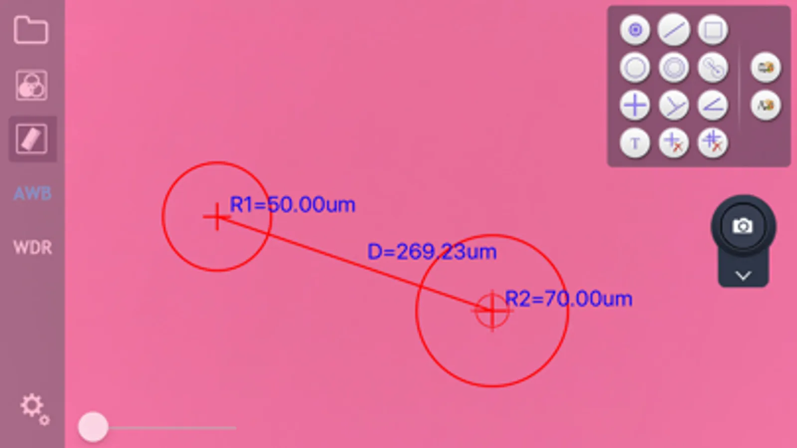 可以实现在预览画面上进行标记的功能,具体标记为点,直线,矩形,圆,同心圆,圆心距,十字线,垂直线,角度,文字, 单个删除,全部删除,可实现实时的添加删除标记,可定义标记文字的不同颜色