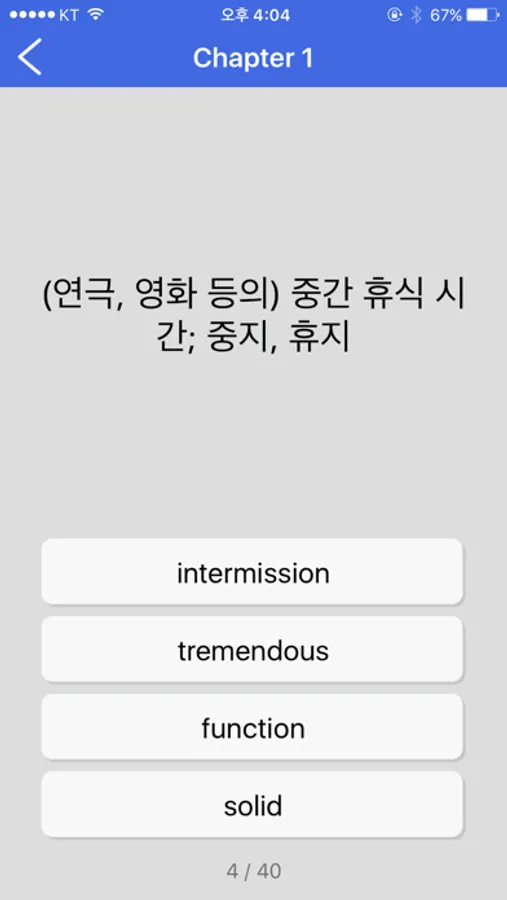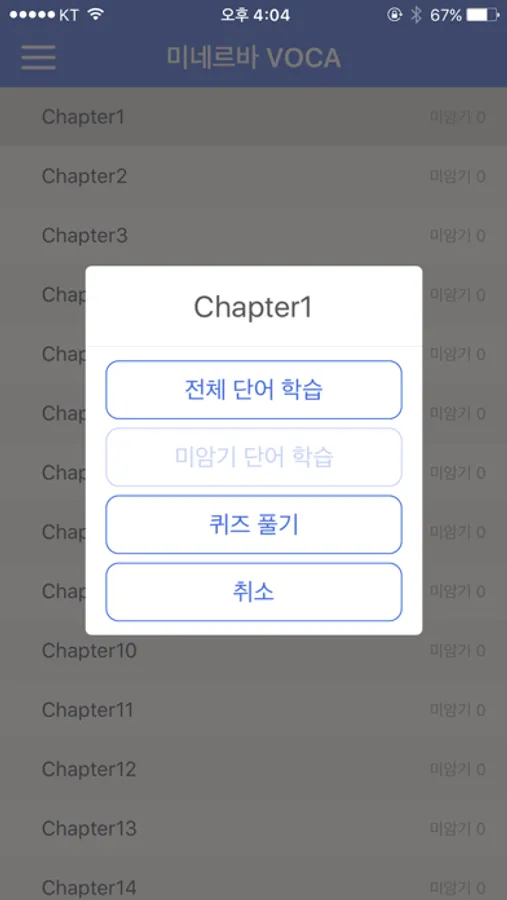 학습한 단어를 대상으로 퀴즈를 진행할 수 있습니다. 틀린 문제만 모아 다시 학습을 할 수도 있습니다.