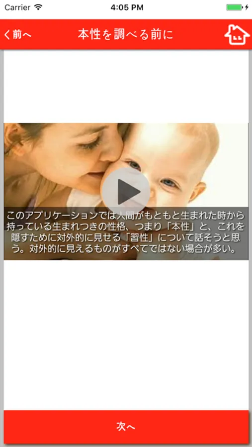 このアプリケーションでは人間がもともと生まれた時から持っている生まれつきの性格、つまり「本性」と、これを隠すために対外的に見せる「習性」について話そうと思う。対外的に見えるものがすべてではない場合が多い。誰にも教えない性格、咄嗟の時に出る性格、我慢してきて爆発する時に出る性格、家族や配偶者に思わず出るようになる性格について述べたい。