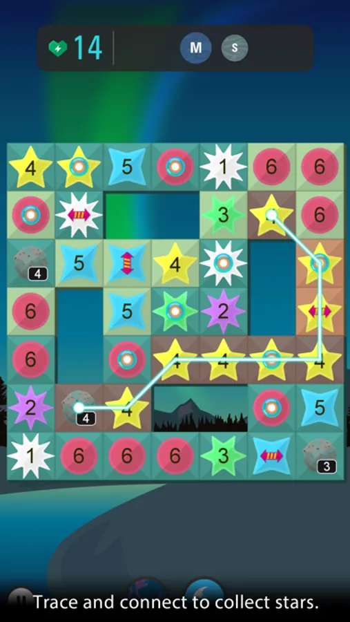 In the puzzle, there are six types of "stardust" ranging from first to sixth magnitude stars. If you trace three or more stardusts of the same type, they will disappear and a higher stardust will appear in their place.