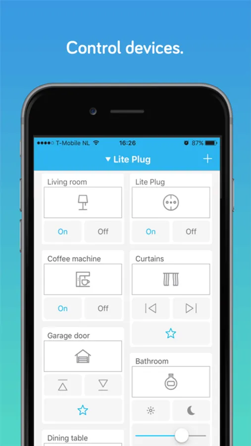 With the Lite app you can control things in your home. Manage the heating in different rooms with radiator valves, turn of lights while in your bed, dim lights to the perfect atmosphere or close curtains automatically when the sun goes down. Lite gives you comfort at your fingertips.