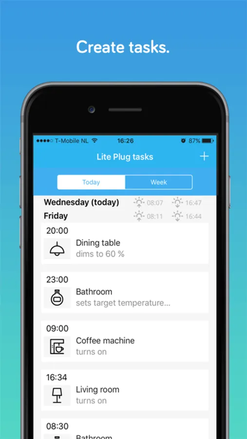 • Create scheduled tasks based on time, sunrise or sunset.