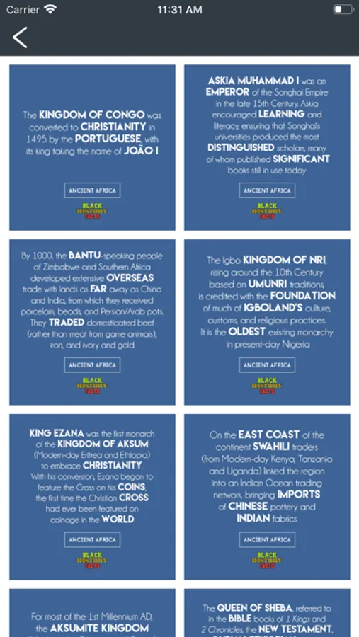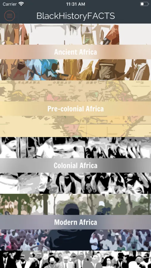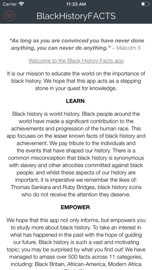 The Black History Facts app is a collection of over 500 facts across 11 categories of black history. We have searched far and wide to bring you facts ranging across: Ancient Africa, Pre-colonial Africa, Colonial Africa, Modern Africa, African-American, Black British, Caribbean History, Black Women, Black Achievement, The African Continent and The Caribbean Islands. You may be surprised by what you find out!