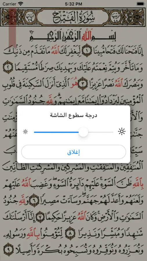 يحافظ التطبيق على وضع الشاشة مضاءة ومنع إقفال الجهاز تلقائياً لمن أراد الاستمرار بالقراءة لفترة طويلة مع إمكانية التحكم بدرجة سطوع الشاشة من أجل راحة العين أثناء القراءة.