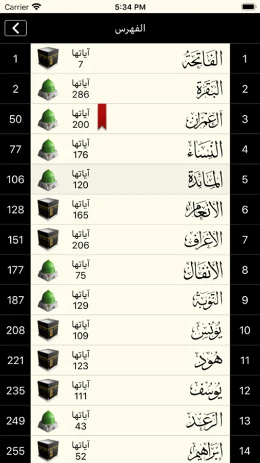فهرس للسور يوضح اسم السورة ورقمها وعدد آياتها ومكية أو مدنية.