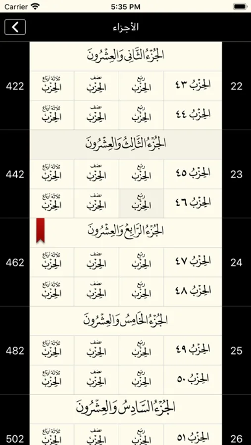 فهرس للأجزاء والأحزاب وأرباع الأحزاب.
