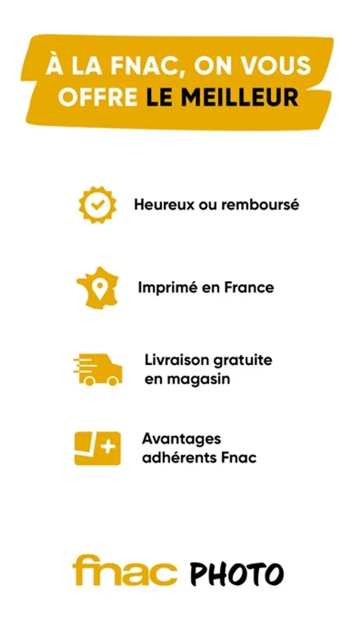 Nous avons pensé cette appli pour vous. Dites-nous ce que vous en pensez : vos avis, vos idées, vos commentaires et suggestions d’amélioration nous aideront à la faire évoluer très vite. Contactez-nous par email à monserviceclient@photos.fnac.com ou par téléphone au 0978470120.