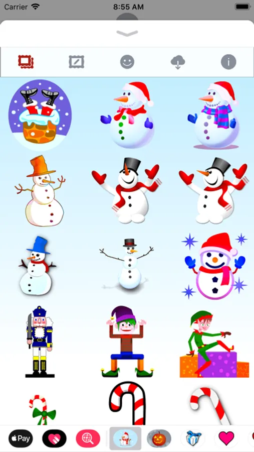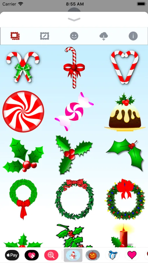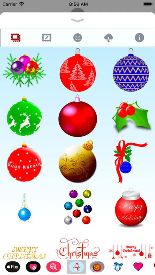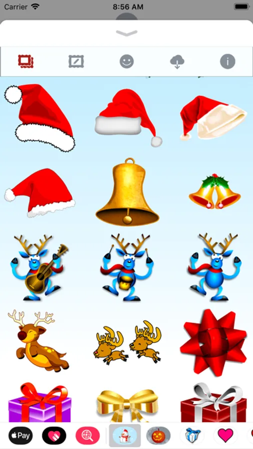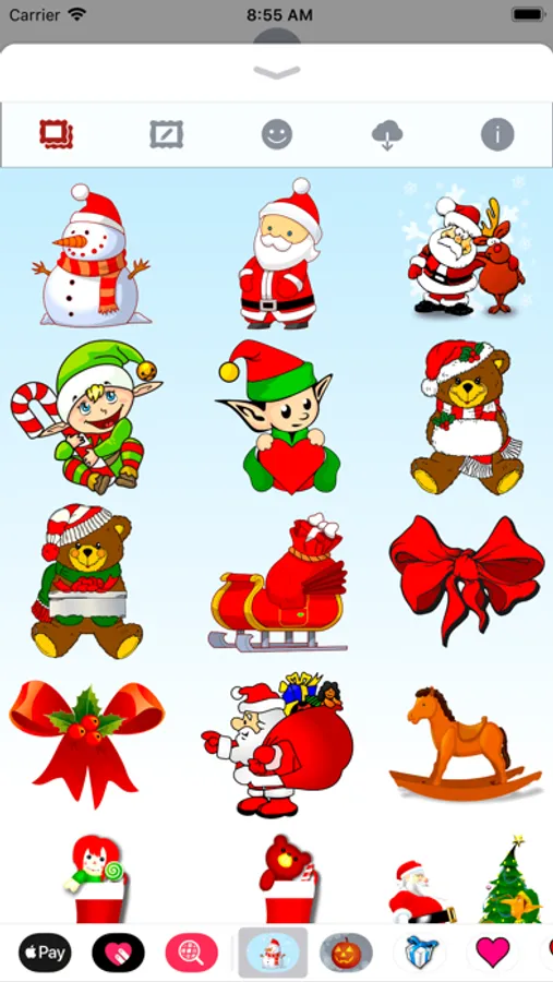 Here are some images you will find in this Sticker pack for iMessage : christmas trees, santas, reindeers, candy canes, snow flakes, ribbons, snowman, banners, elf, gingerbread man...