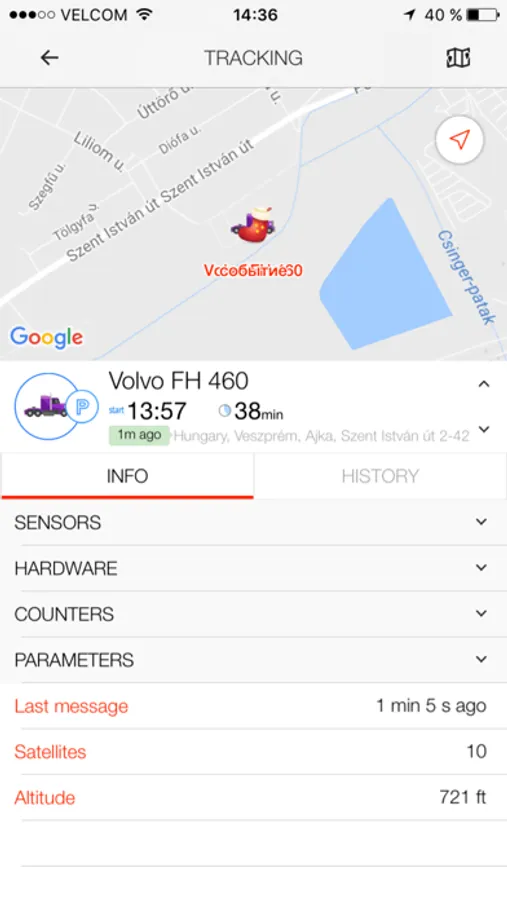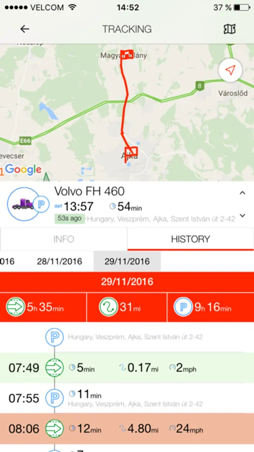 The map view (TRACKING) shows all your vehicles with real time movement. Your position is also shown which makes it easy for you to relate with the locations of your vehicles. This also helps you to reach your vehicle easily.