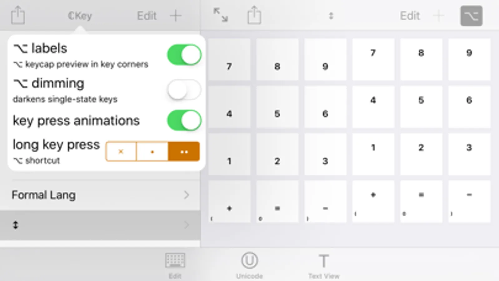 - Hold the + button to add a batch of keys, by splitting text into its individual characters (or unicode scalars).