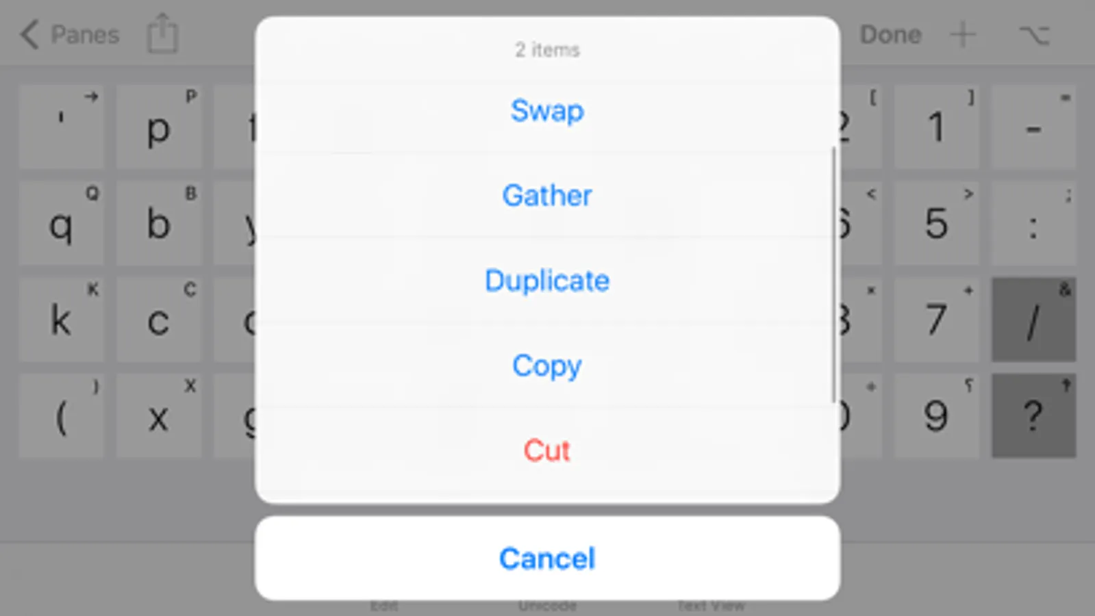 + Cut, copy, and paste - use their established meanings (the pasteboard is shared between panes).