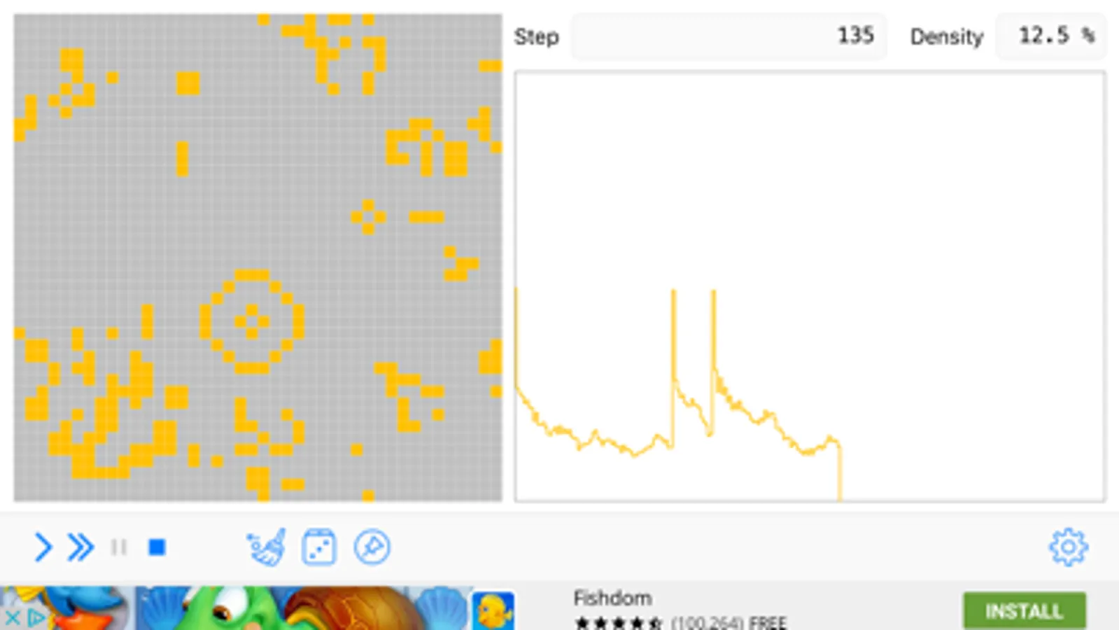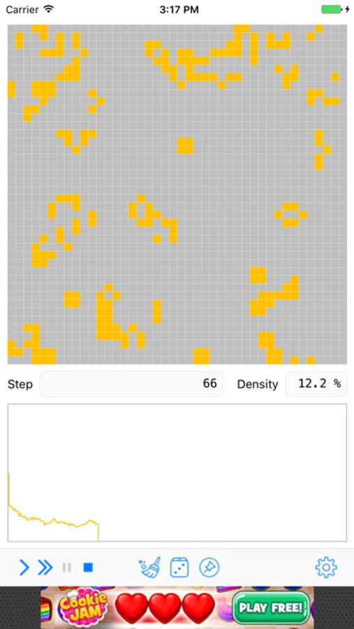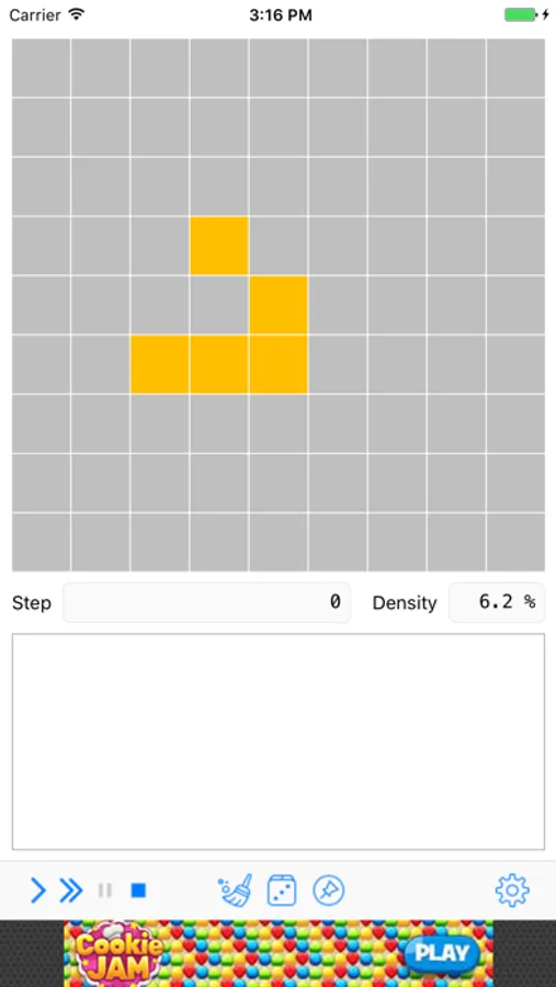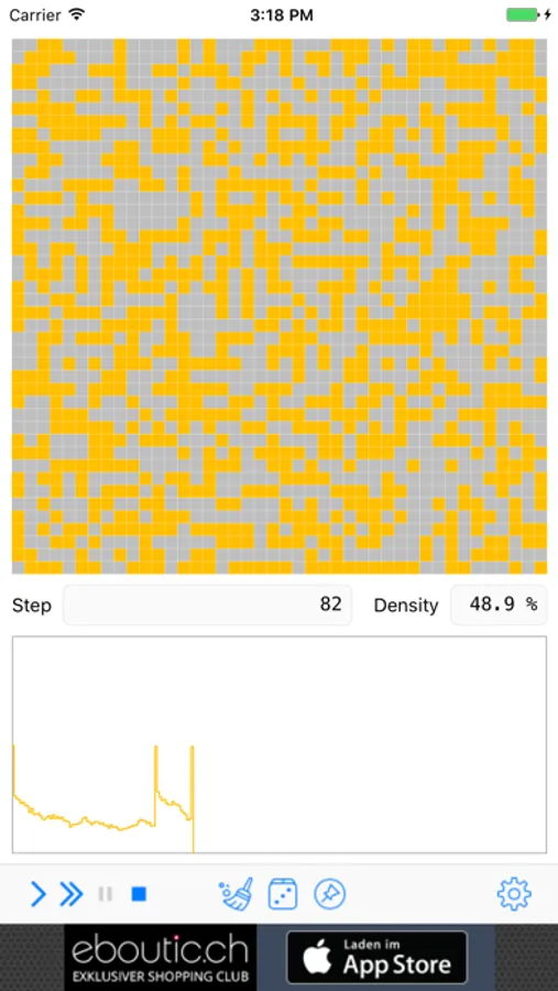 Use the simple arrow to simulate a single step or the double-arrow for the loop mode. Pause with the double bar and stop the with the square. The broom clears the matrix and the dice sets it to a random initial state. The pin saves the current state which will be reloaded by stopping the simulation. Tapping a cell in the matrix toggles the state