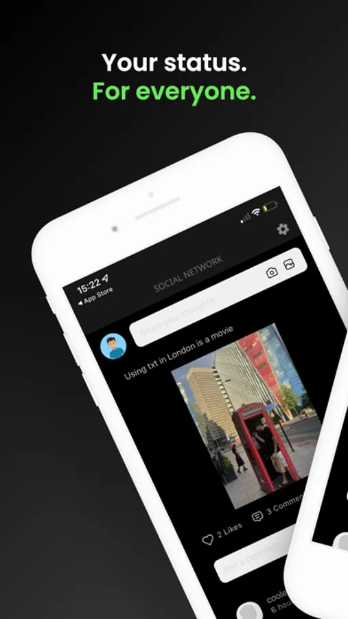 Social network, txt, is the perfect platform for users 17+ to connect with like-minded individuals. Unlike other social networks, our app is free from bots and illicit content, ensuring that users can have genuine and meaningful interactions with one another. With our strict content moderation policies, users can feel safe and comfortable sharing their thoughts, ideas and experiences with others. Join now and be a part of a community where you can truly be yourself. Get started by logging in with your Apple ID. After signing in, the social feed in the app allows you to share your status. When you post a status on the social feed, people worldwide may see it. All users currently share one status feed. You may block other users and we moderate for fake accounts as well as illicit and illegal content.