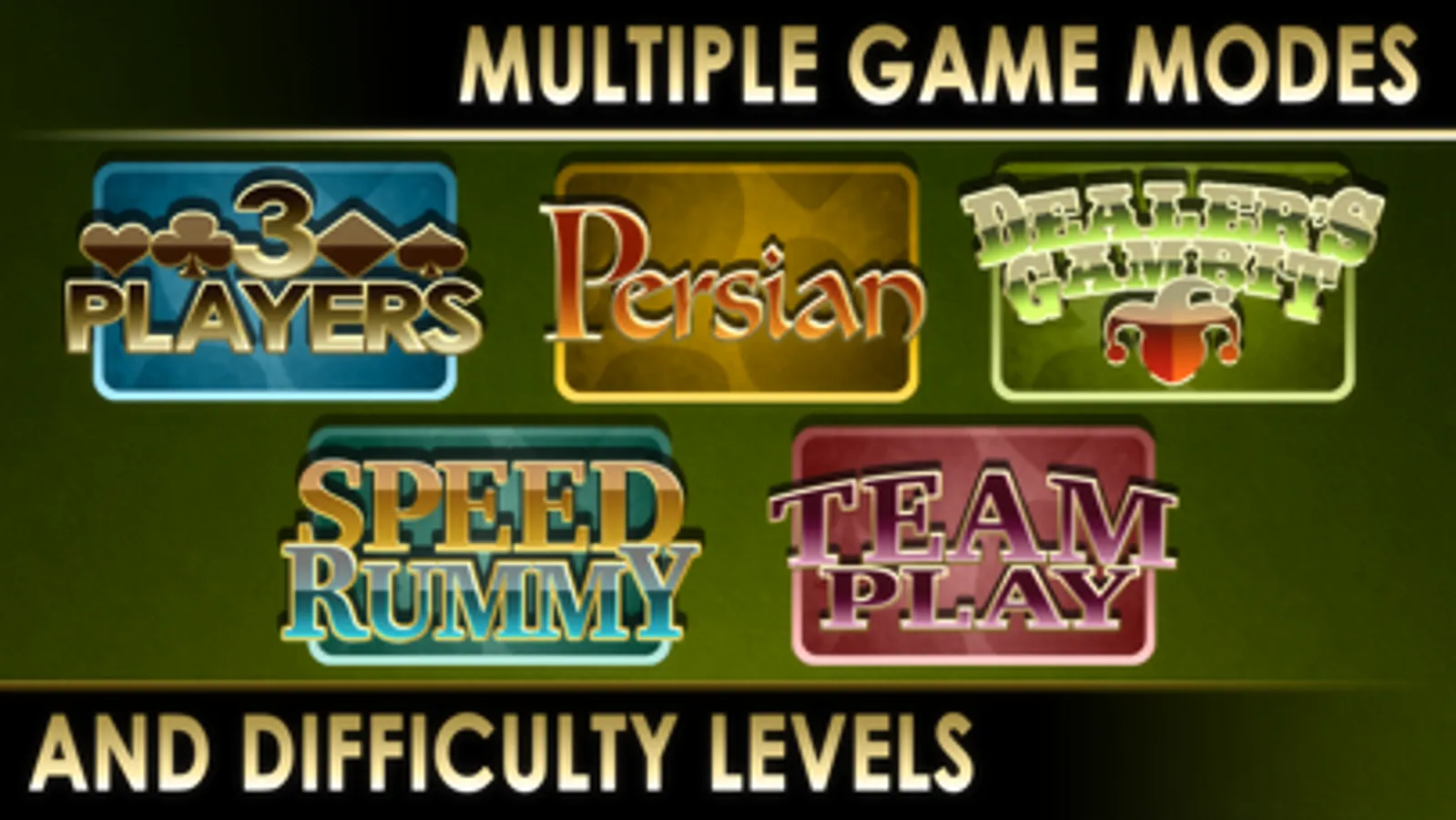 • Six Unique game modes: Regular, 3 Players, Team Play, Speed Rummy, Dealer's Gambit and Persian!