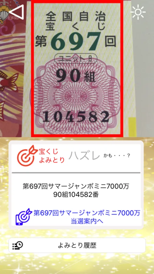※カメラによる自動判別は、当選の結果を保証するものではありません。当選番号につきましては、必ず公式の情報をご確認下さい。万一、本アプリ利用の結果損害生じても一切の責任を負いませんのでご了承下さい。
