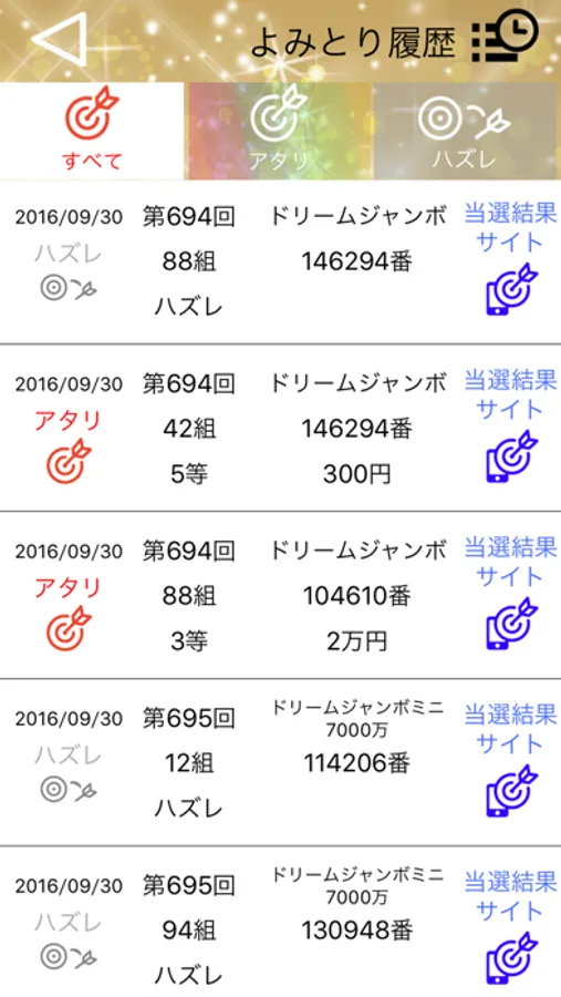 過去に読み取ったくじを表示することができます。「アタリのみ表示」、「ハズレのみ表示」と結果毎の表示も可能です。