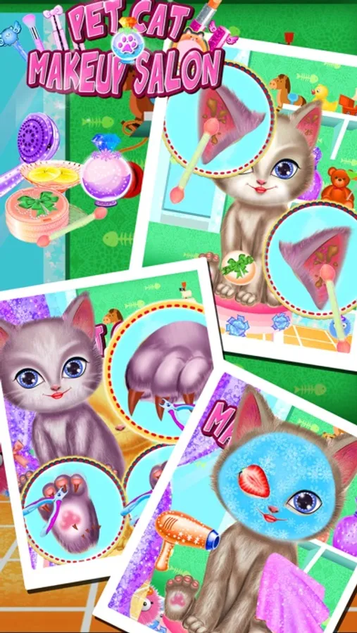 There are three very lovely pet cats in our brand new make up game. If you love pet, then join in this wonderful game and have fun. First step, you need to make over for the cat. Choose one pet that you like and then make over for her. Use the brush to get rid of those dirt and leaves on her body. Give her a nice bath and use the towel to dry her. After that, you need to use the cotton swab to clean those dirty things in her ear. Moreover, use our given tools to cut her nails one by one and help the pet make facial and eyes masks to make her skin look fresh. At last put some facial cream on her face. Second step, you need to prepare some food for the pet and play with her. Third step, come to use out given cosmetics to make her up beautifully. Choose the suitable eye shadow color for her and let her wear one pair of fashion contact lenses. Select the most beautiful color of blusher and lipstick that she like. Fourthly, dress up for the cat by mix and match those cute clothes until the best one that suits her. Decorate her beauty with fashionable hairstyle and other accessories. At last show us this cute pet.