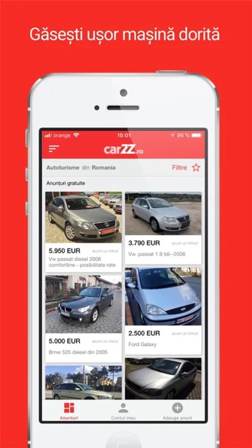 E timpul să îți cumperi o mașină? Cu Aplicația CarZZ.ro vei putea găsi, chiar astăzi, mașina ideală pentru tine! Aici găsești anunțuri cu autoturisme noi sau puțin rulate și mașini second hand, din toată România.