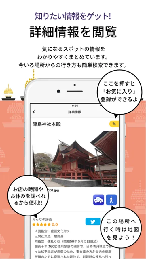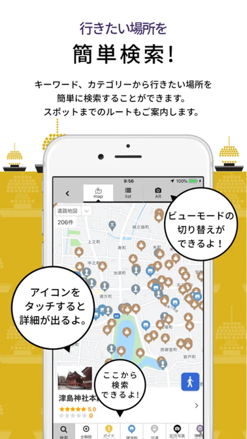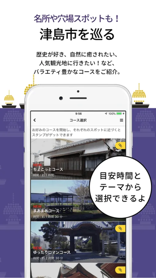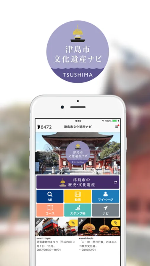 愛知県津島市には、多くの文化遺産が残っています。このアプリケーションでは、テーマごとに観光スポットや文化遺産を巡るための探訪ルートを紹介する「コース」機能と、マップやリスト一覧で、目的のポイントまでご案内する「ナビ」機能があります。