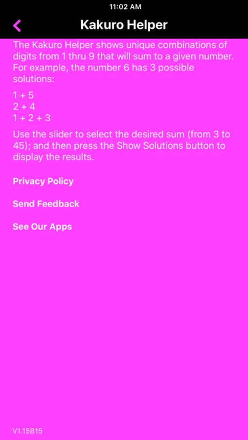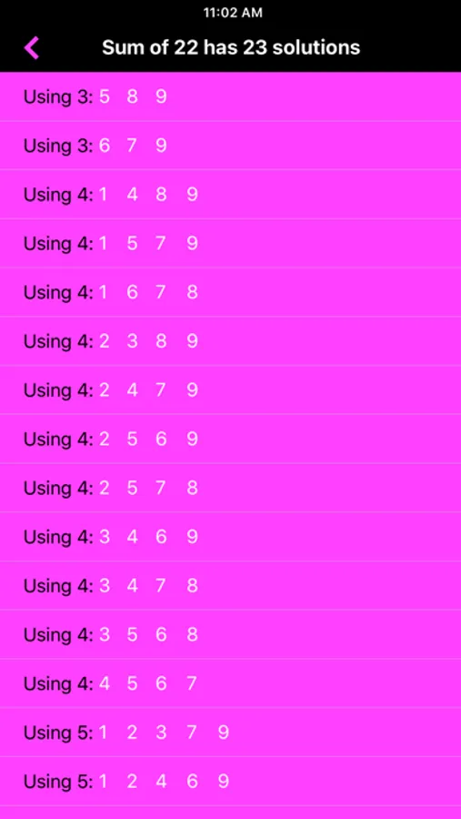 Scratching your head on a section of a Kakuro puzzle? Well, here's some help. Just select the sum you need and all combinations will be displayed! Supports numbers from 3 to 45. No adds or in-app purchases.