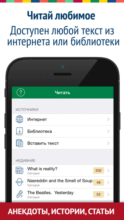 Читаете интересный вам текст, отмечаете знакомые слова, переводите с помощью встроенного переводчика незнакомые слова. Далее запоминаете их через эффективные упражнения.
