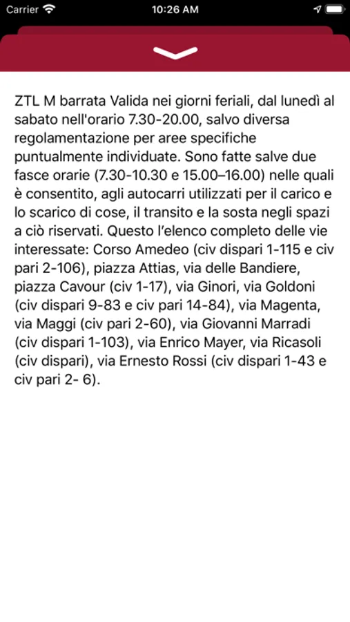 L'app permette, una volta stabilita la posizione tramite Gps o rete wifi se disponibile, di sapere se siamo in una zona a traffico limitato o sosta controllata.
