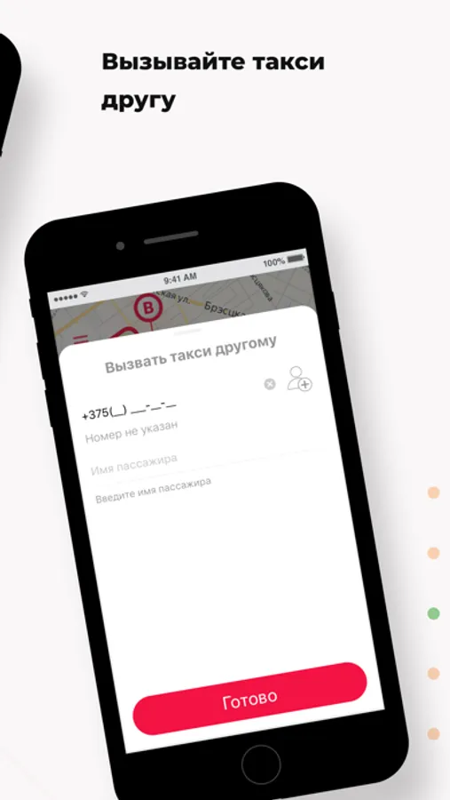 Используйте опцию “Вызвать такси другому” в разделе “Пожелания” и укажите его номер телефона. Когда такси подъедет, на указанный номер придет СМС, а вам — сообщение в приложении.