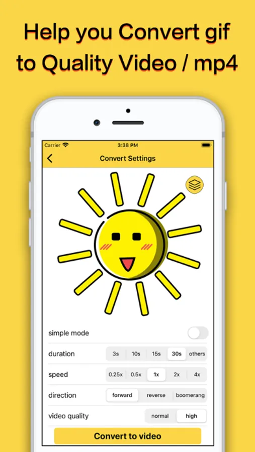 Using GIFConvert.er is simple! Select your favorite GIF from your photos or Cloud, adjust the playback speed, direction, video duration, and exporting quality, then convert it to a video and share it with your friends. We also offer a simple mode for quick conversions, where you only need to set the playback repeat times of your GIFs to convert them into videos in no time.