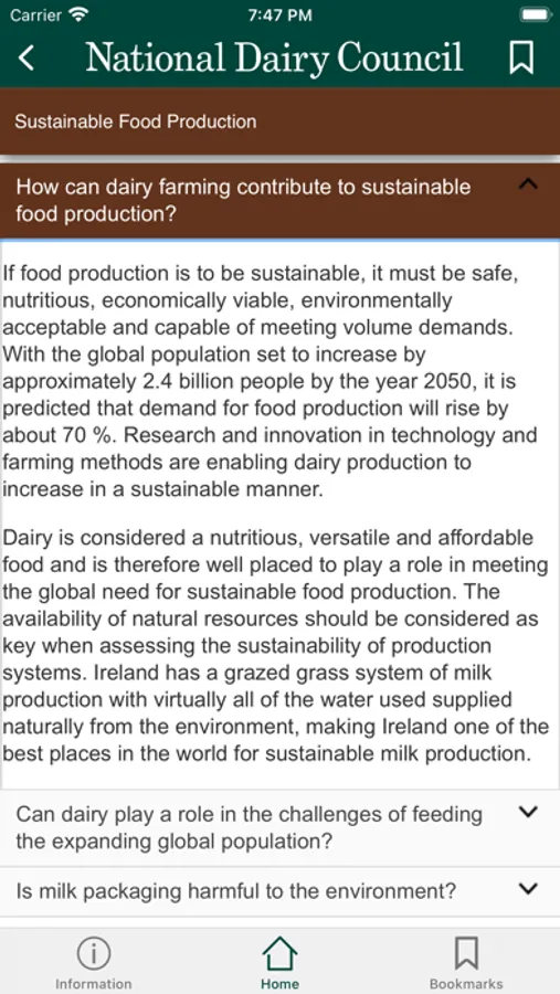 This ‘ Dairy A to Z’ App is composed of nearly 200 questions and answers relating to dairy including Nutrition, Health, Quality & Safety, Animal Welfare, Environment & Sustainability; and Dairy Products. It is designed to provide concise, factual information and we hope that it helps you to discover the unique qualities of Irish Dairy.