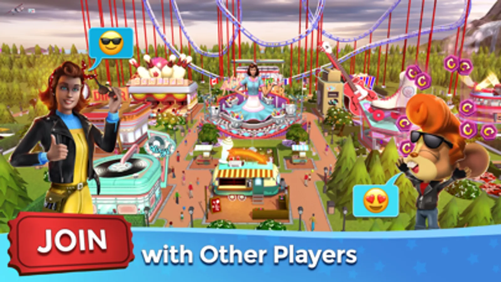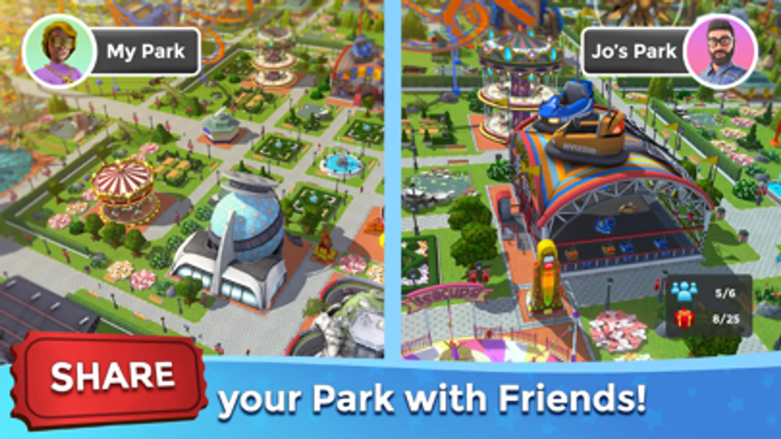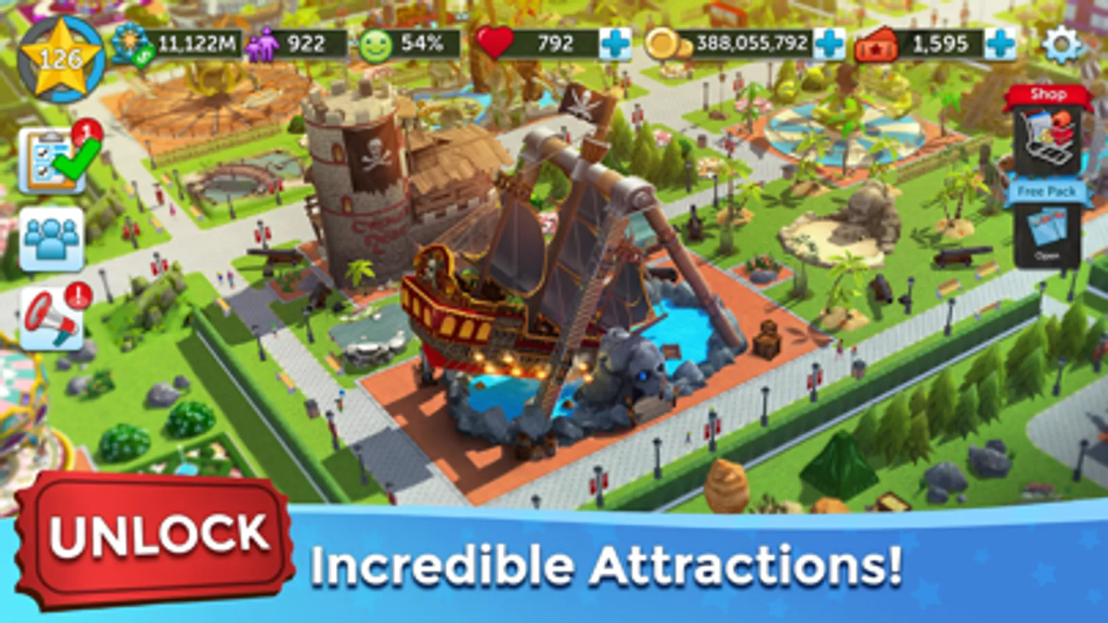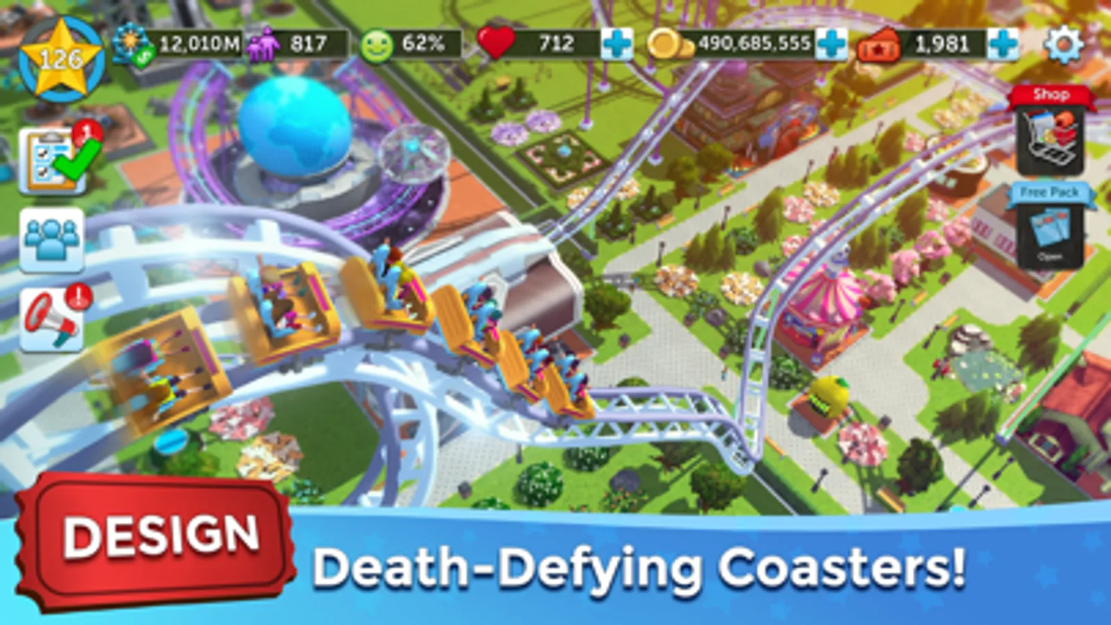 Set prices, start marketing campaigns, install decorations, even color each building. All to maximize customer satisfaction and increase your daily attendance. You can even trade-in and upgrade to rare and epic-level rides and buildings. The more successful you are, the larger you can make your park, and the more you can build and manage!
