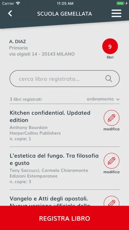 - funzione registrazione titoli attraverso scan del codice a barre o inserimento isbn (solo per Librerie loggate e gemellate con le Scuole)