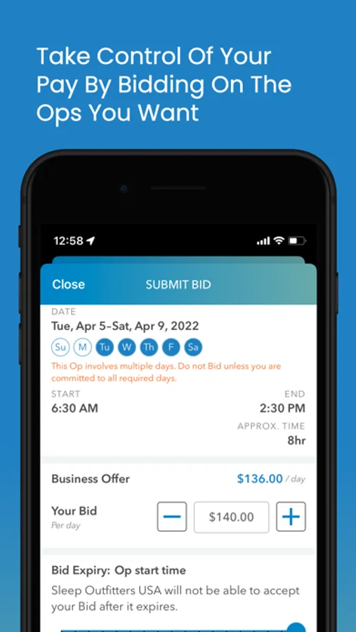 When you submit a bid on an Op, your Operator Profile is displayed to the business. Your profile is the primary way businesses decide which bids to select to fill their Ops. Please make sure all your relevant skills and certifications are accurate to maximize your marketability when bidding on Ops.