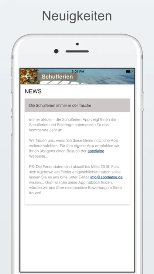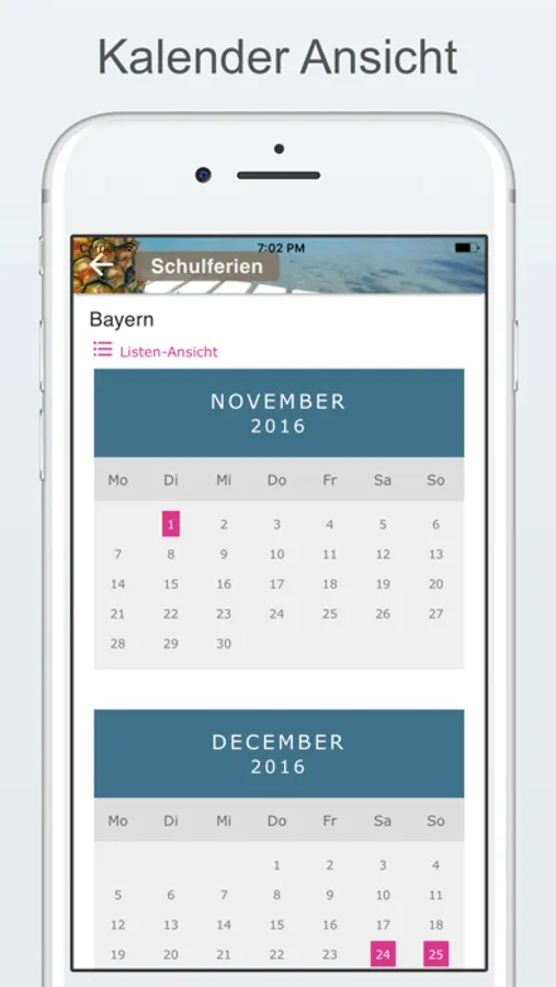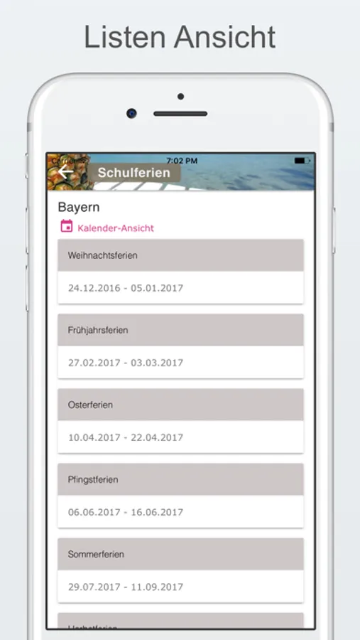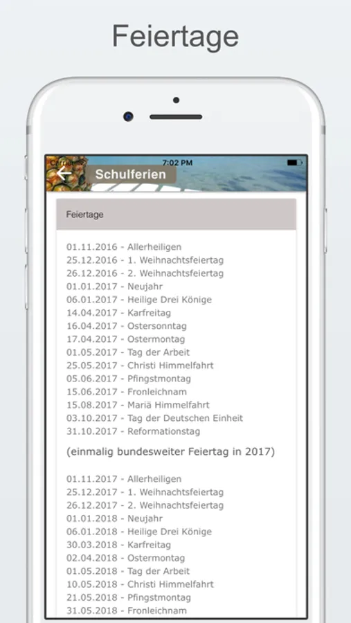 Mit dieser gratis App erhalten Sie die Schulferien und Feiertage für alle deutschen Bundesländer ganz einfach und praktisch in die Hosentasche. Eine Listen- und eine Kalenderansicht zeigen Ihnen schulfreie Tage stets aktuell für das kommende Jahr.