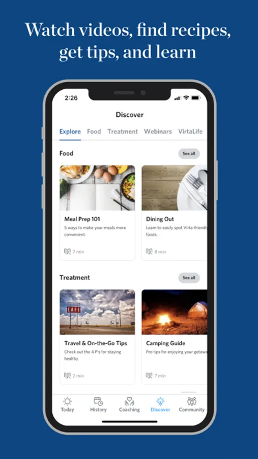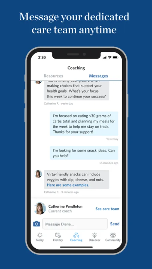 Through the app, Virta patients have access to the full Virta Clinic experience, including: