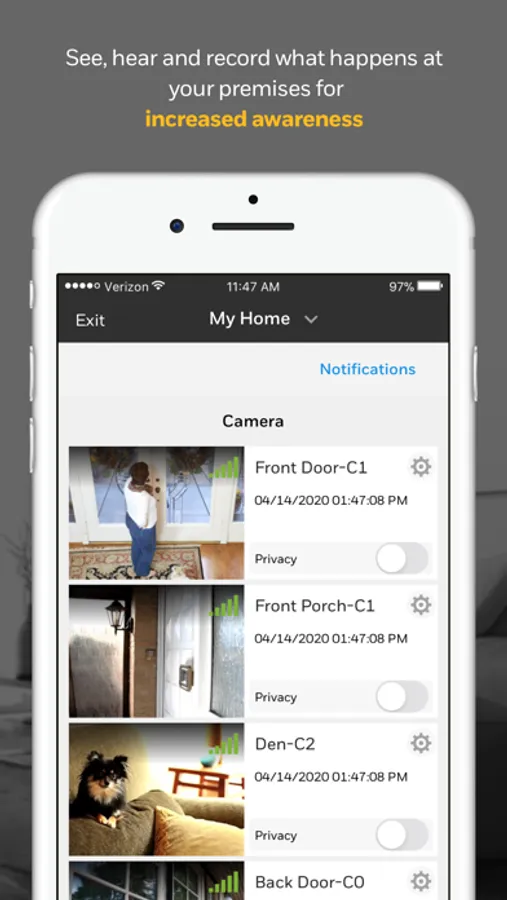 Requirement: Compatible Honeywell security systems with a subscription to Bay Alarm Connect Remote Services. Please contact your security professional for additional information.