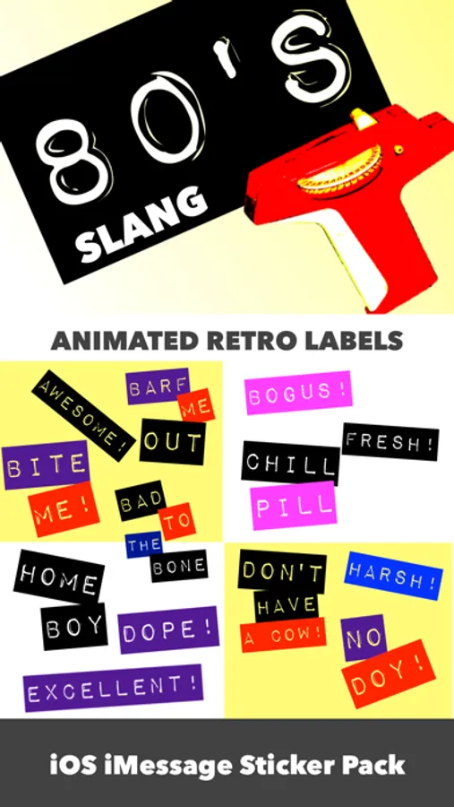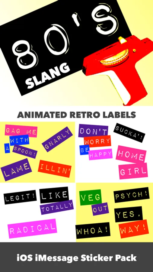 This STICKER PACK for iMessage has over 30 'Radical!' phrases from the 1980's. They will help keep your iMessage conversations 'Legit!', or you can 'Gag Us With A Spoon!"