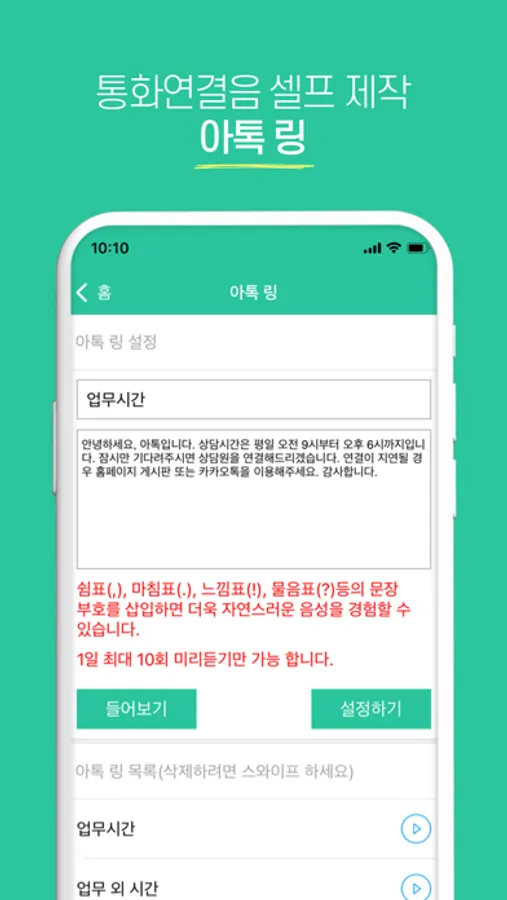 원하는 시간과 요일에 내가 만든 통화연결음을 송출할 수 있어요.