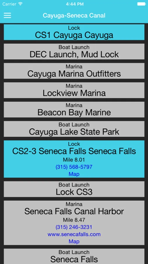 An app designed to help out those traveling along the Cayuga-Seneca Canal by showing the Boat Launches, Locks, Lift Bridges, and Guard Gates along the canal’s path.