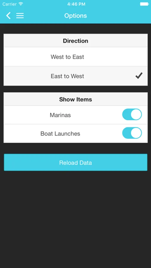 The primary view of the app shows a list of all the landmarks along the canal, with their distance along the canal along with a phone number that the app can dial in order to contact the marinas, and locks on the route. In addition to this, there is also a map view that precisely shows the location of everything along the canal’s path. An options page allows you to filter out the types of landmarks that the app shows (on both the list and the map), as well as allowing you to switch the list to an east to west orientation.