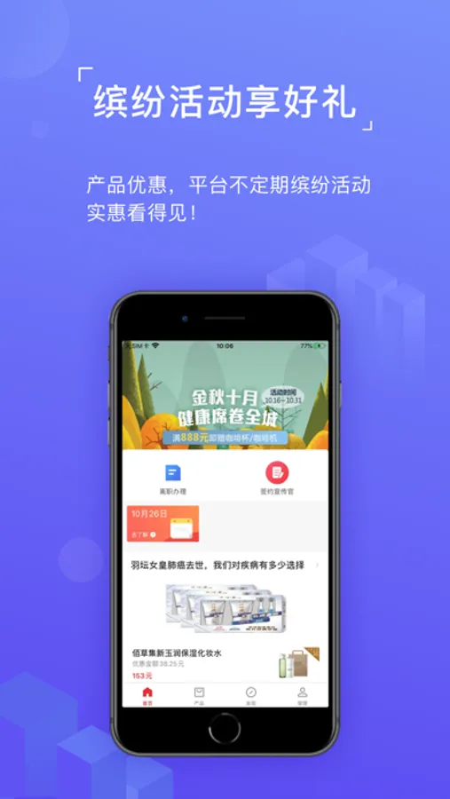 新人好礼/积分计划/1元秒杀/限时抢/新品优惠/保险专场/节日活动……平台不定期缤纷活动,给您看得见的实惠!